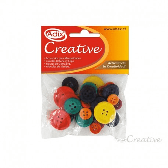 Botones de madera colores surtidos. Contiene 30 unidades. Producto no apto para niños menores de 3 años.