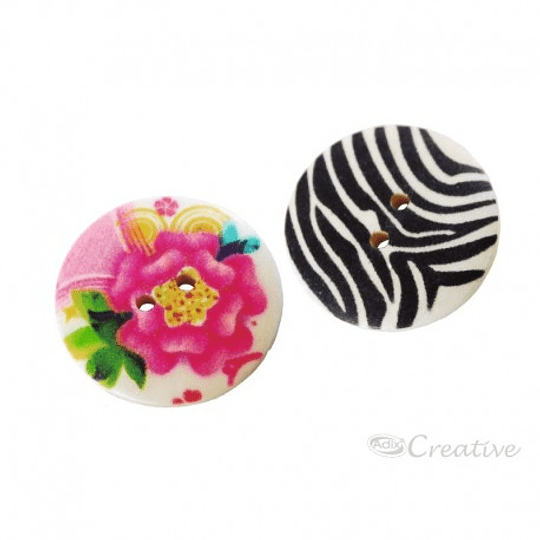 Botones de madera pintada, miden 30 mm cada uno. Contiene 5 unidades. Producto no apto para niños menores de 3 años.