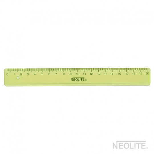 La clásica regla verde Neolite para el colegio, universidad o la oficina. En plástico translúcido que permite observar la superficie de medición. Biselada y con borde antimanchas. Alta resistencia y flexibilidad. Medida de 20 cm.